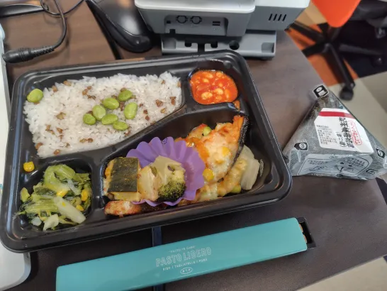 こんにちは!デルフィNo00? 利用者のミカDです。毎日デルフィにてパソコン入力作業に勤しんでおります。体調を考えて働くのはなかなか大変ですがデルフィならではの楽しみもあります。スタッフとの軽妙なトークと、お昼のお弁当!トークの方はトーク力MAXの強者スタッフが揃うデルフィ。仕事場はもちろん送迎車の中でも色んな話題でトークの花を咲かせて楽しいのです。もちろんマジメな仕事の話もしますが…スタッフF氏のディープな趣味の話は一聴の価値アリです。そして楽しみその2、お弁当。デルフィスタッフが厳選してくれたお弁当は、どこか上品。はっきり言っておいしい。毎日楽しみなのです。ランチは持参する事もできるのですが、限られた予算でバランスのとれた昼食をとるのは至難です。自分で料理する訳でもない…デルフィでお弁当を頼めばリーズナブルで栄養バランスのとれた昼食をたべられます。あ、写真右のおにぎりは個人的な増し増しアイテムなので。デルフィで、”おにぎりください”と言っても出ません。あしからず。