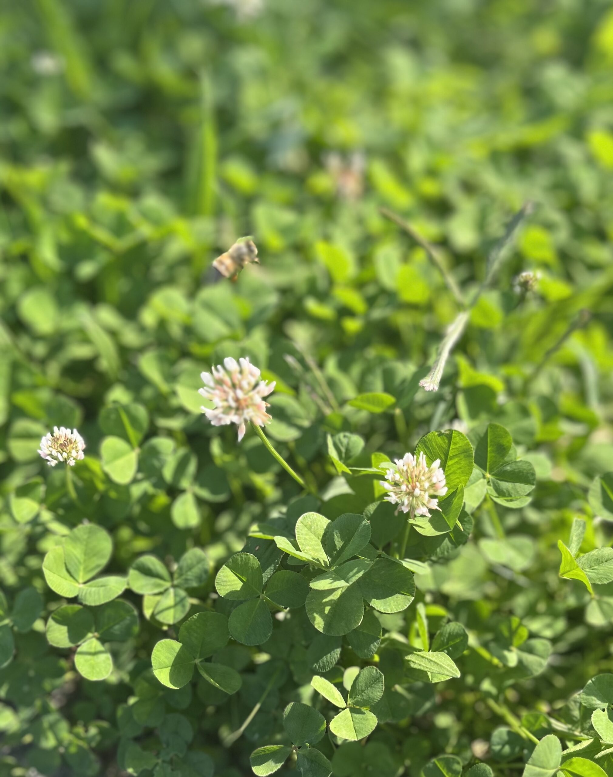 こんにちは😊あゆ🔰です。 今週も始まりましたね。土曜日は子供のサッカー教室の送り迎えしながら見学しながら…で天気も良かったので風が気持ち良く見学日和でした☀️ 石🪨のベンチ風のところに座って見学していましたが、足元にシロツメクサ☘️がたくさん生えていて、そういえばよつば🍀のクローバー見つけたことがないなぁ…と思いながらチラチラとよつば探しつつ見学しました😄 サッカー終わり子供が戻るのを待ちながらシロツメクサの花綺麗だなぁ…と眺めていたらちょうどミツバチが🐝とまったのでシャッターチャンス!と急いで写真を撮りましたが飛び立った瞬間でした💦がミツバチらしき🐝姿は捉えられたので、写真こちらにあげてみます😄